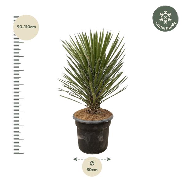- Uiterlijk van de Yucca Filifera Australis: De Yucca Filifera Australis heeft lange, dunne, grijsgroene bladeren die sierlijke vezels aan de uiteinden hebben. De bladeren groeien in een rozetvorm vanuit een stevige stam. De stam zelf is dik en verhout, en kan een indrukwekkende hoogte bereiken, wat de plant een exotische uitstraling geeft.